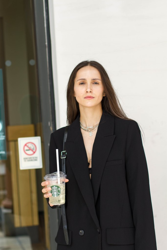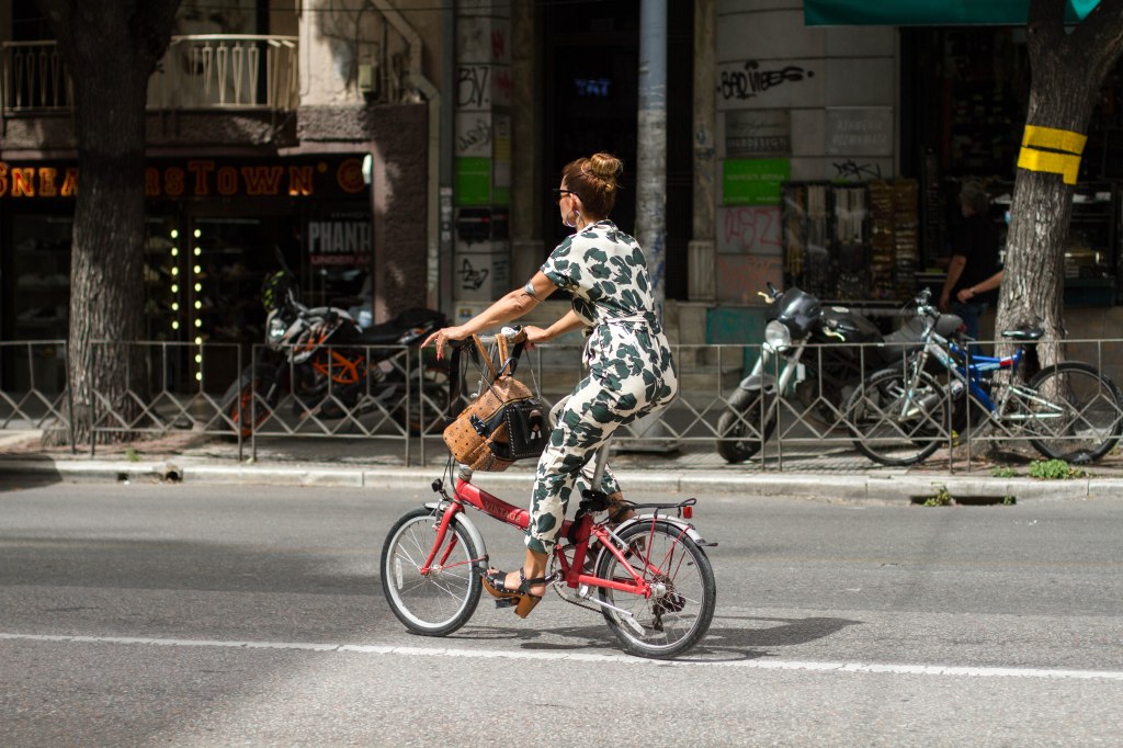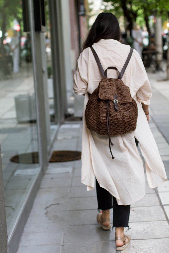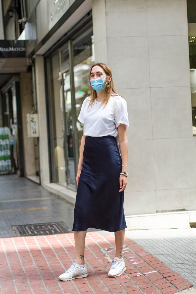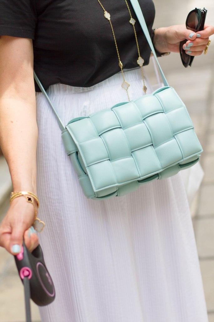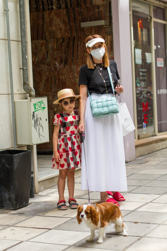 Padded τσάντα Bottega Veneta βρείτε τη εδώ, Φούστα COS βρείτε τη εδώ, Bottega Veneta sandals βρείτε τα εδώ, Σκίαστρο (VISOR) JACQUEMUS βρείτε το εδώ